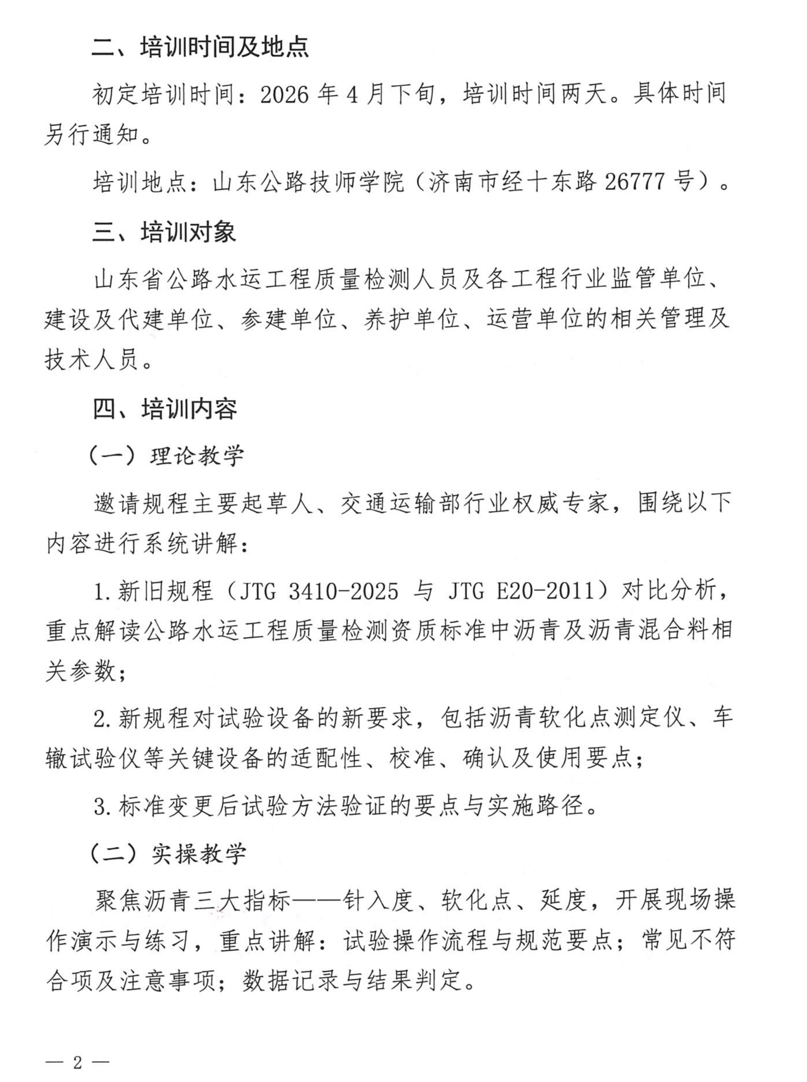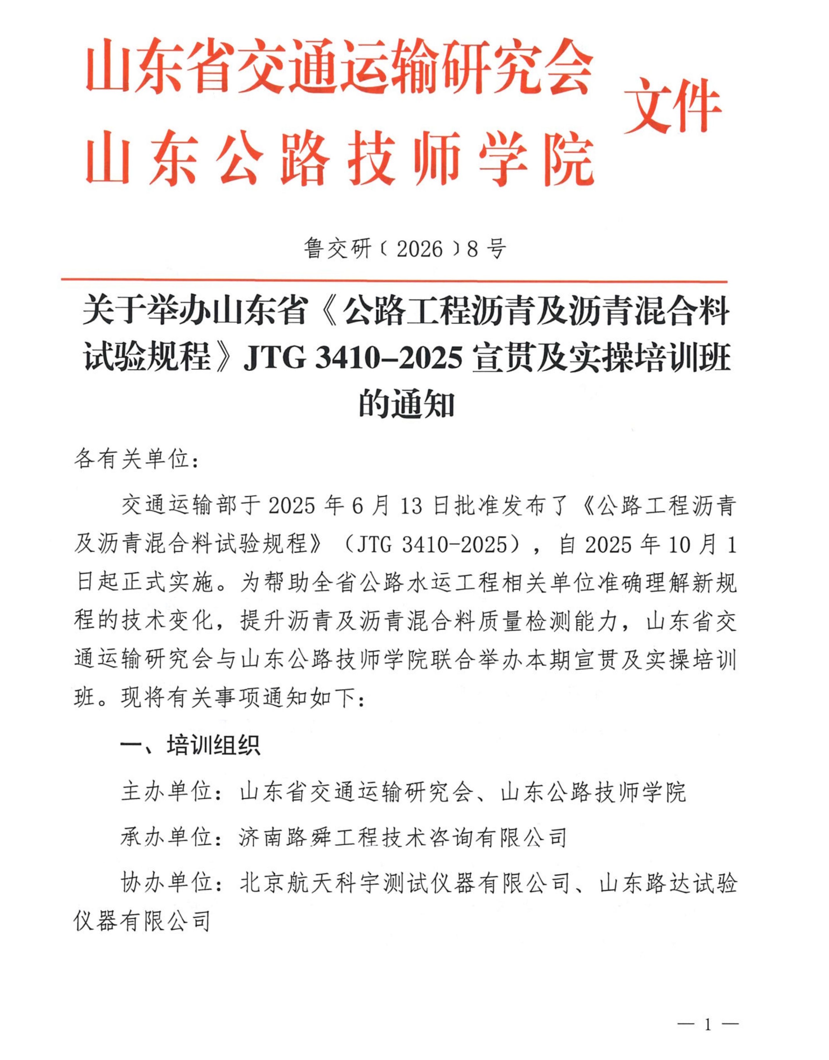 关于举办山东省《公路工程沥青及沥青混合料试验规程》JTG 3410-2025宣贯及实操培训班的通知